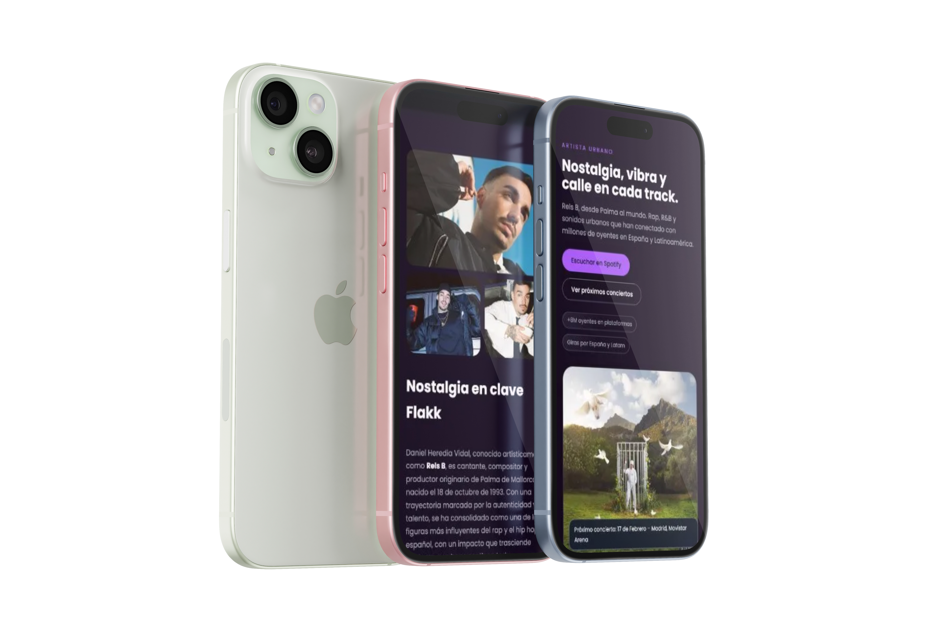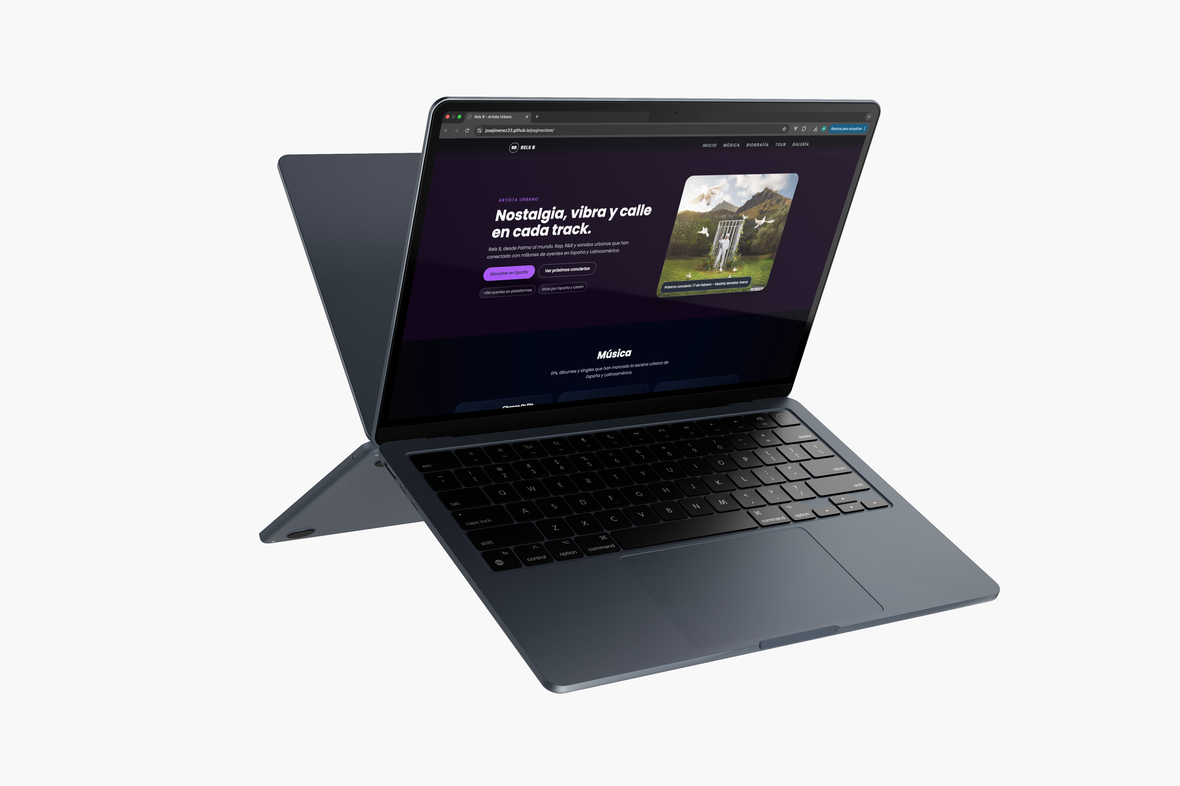 En la fase visual, apliqué una paleta en "Modo Oscuro" con degradados púrpuras para mantener la identidad del artista. A nivel técnico, la web está desarrollada con HTML5 y CSS3 nativo, utilizando sistemas de Flexbox y Grid para que el diseño sea totalmente adaptable. Es un sitio funcional, con una navegación fluida y optimizado para diferentes resoluciones.