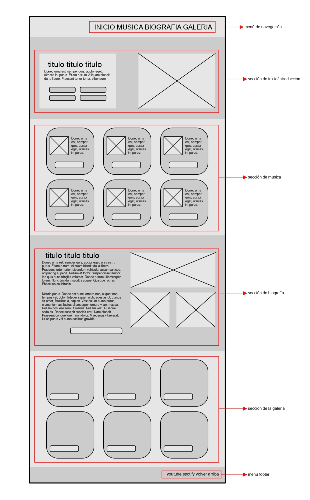 Como parte de mi metodología de trabajo, el proyecto comenzó con una fase de análisis de contenidos. En este wireframe, definí la jerarquía necesaria para una web de artista: desde la navegación fija hasta la estructura de grids para la música y la galería. Este esquema analítico permitió validar la usabilidad antes de la fase de desarrollo.
